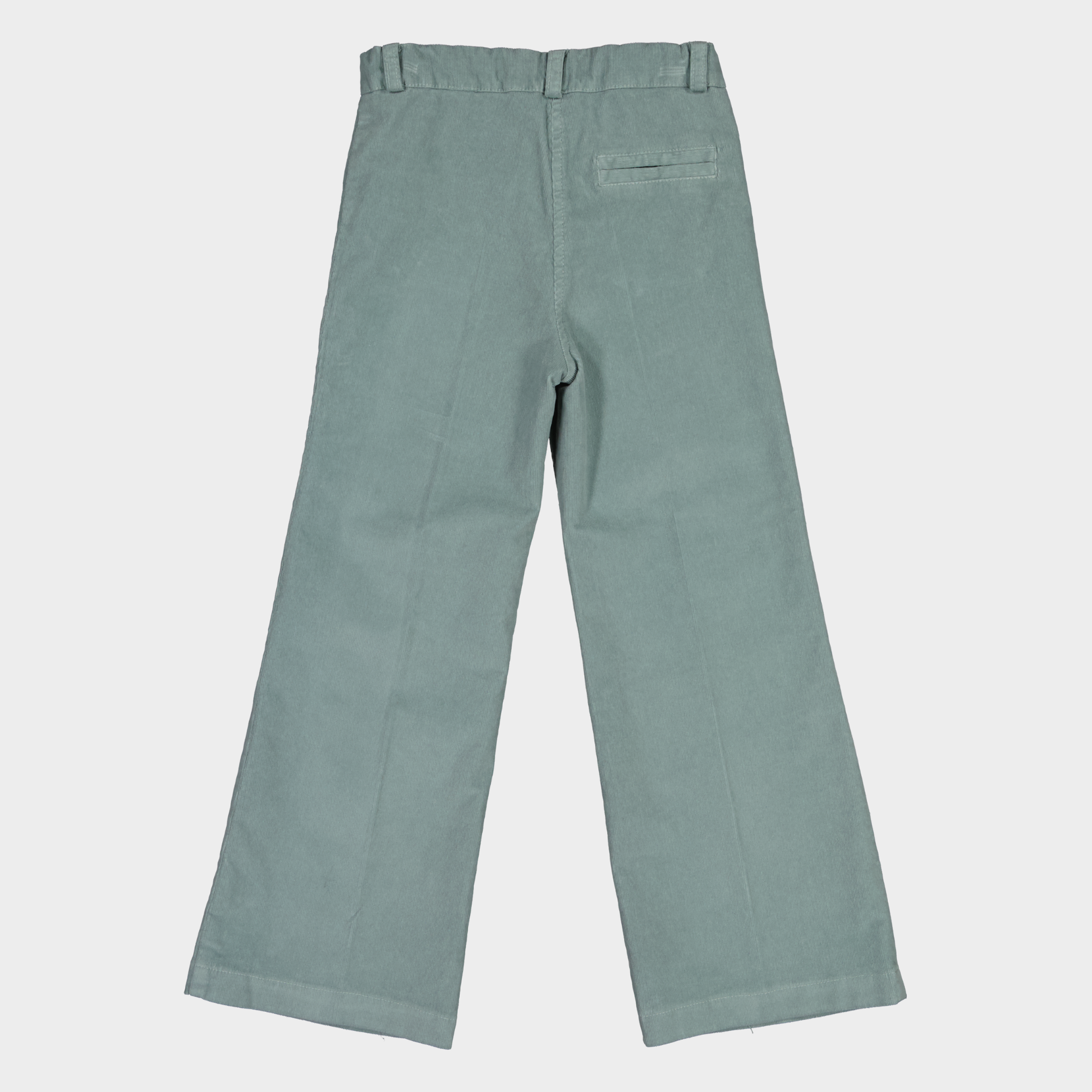 Pantalón pana verde agua, tacto cálido, ligeramente acampanado.Cintura ajustable.Botón frontal con cremallera.Trabillas cinturón.Bolsillos vivo frontales y dos bolsillos traseros.Interior con forro de flores a contraste.