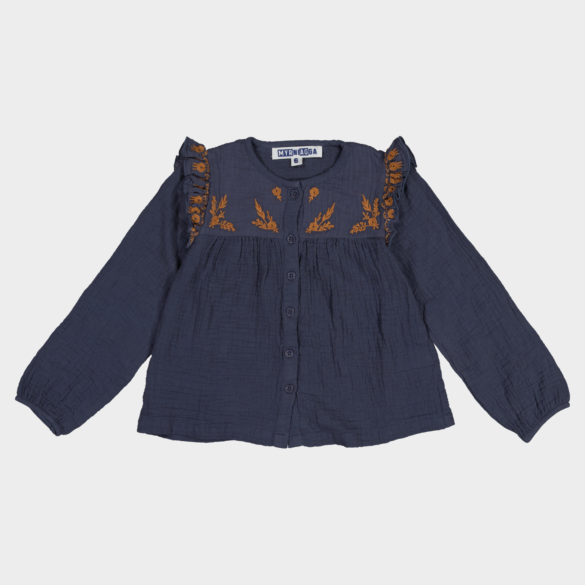 Blusa doble tela bordada a contraste.Cuello redondo con vivo.Mini volantes bordados en hombros.Abertura frontal con botones.Mangas largas con puños de vivo con elático.Corte ligeramente evasé con dos aberturas laterales.