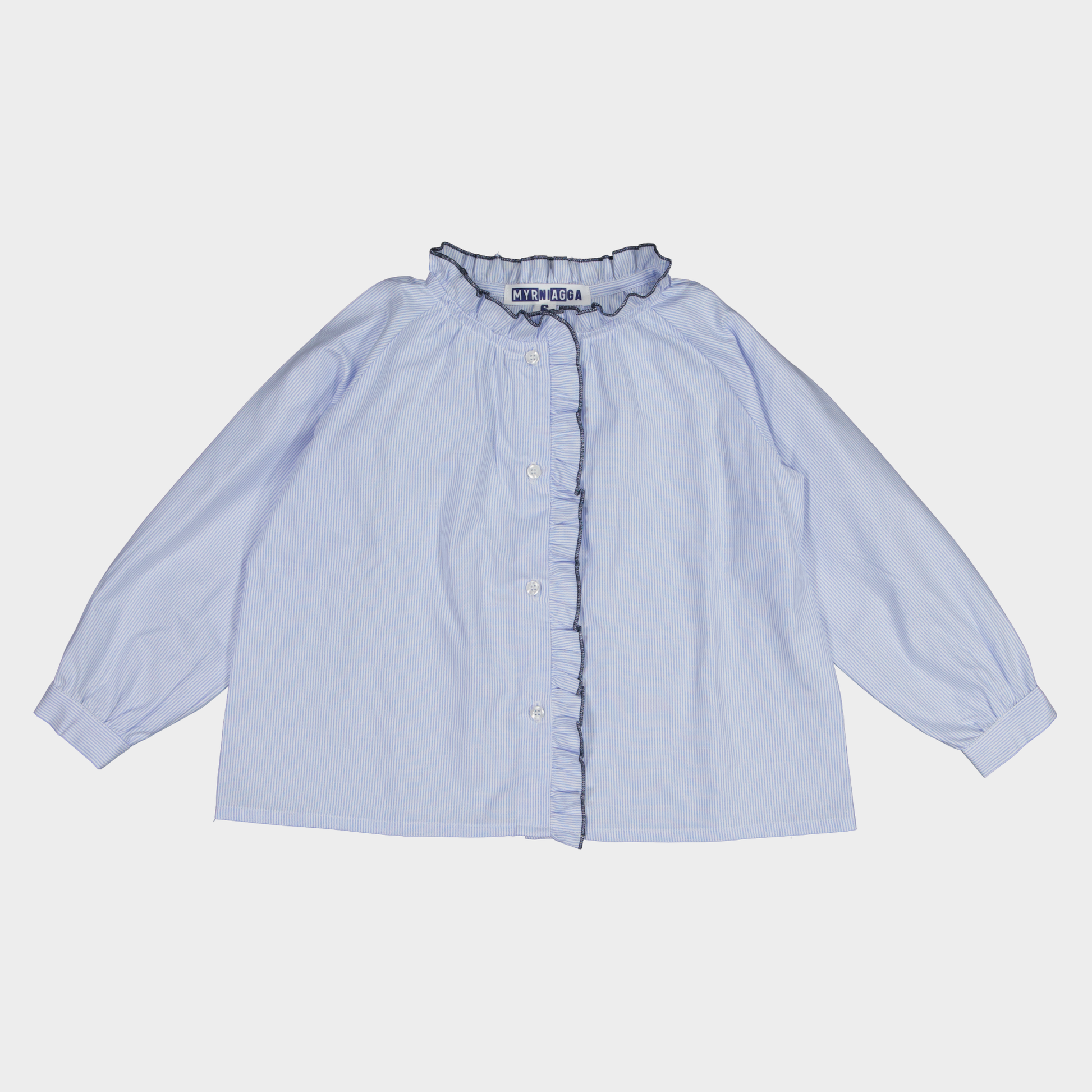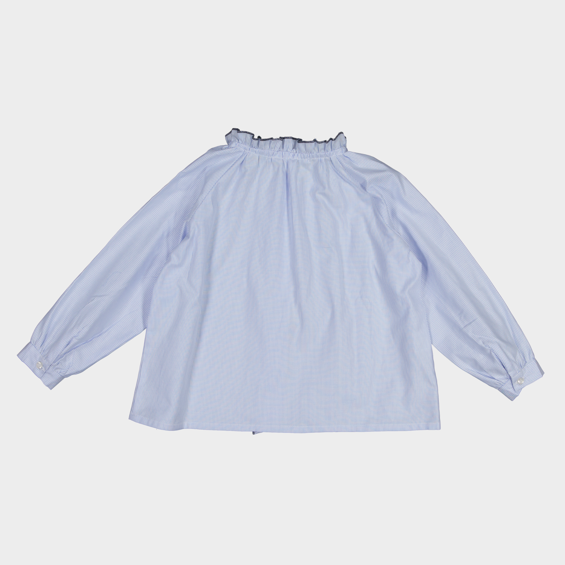 Blusa celeste de rayas.Cuello redondo con mini volante.Mangas largas con abertura en puños.Abotonada en delantero con mini volante en tapeta.Festón a contraste.Confortable.