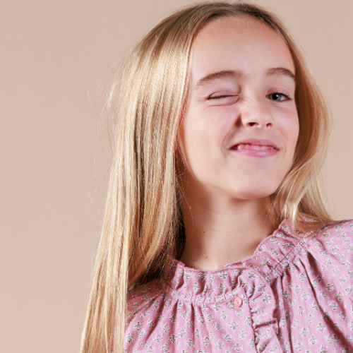 Blusa rosa con estampado de flores.Cuello redondo con mini volante.Mangas largas con abertura en puños.Abotonada en delantero con mini volante en tapeta.Confortable y cálida.