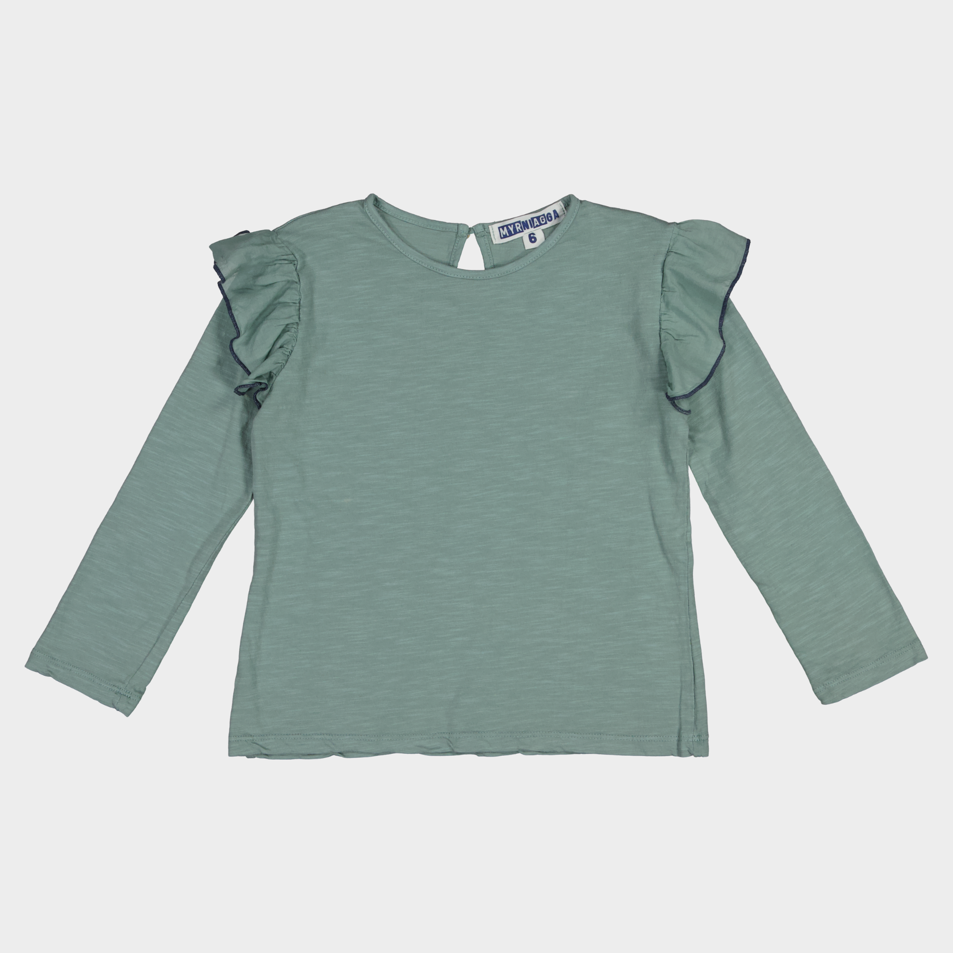 Camiseta verde agua combinada con voile.Cuello redondo cerrado con botón en espalda.Volantes en hombros en voile con festón a contraste.Mangas largas.Corte recto.