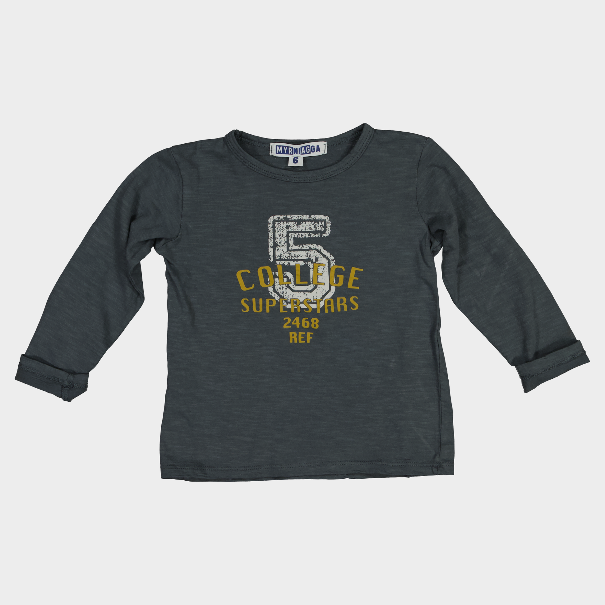 Camiseta gris de manga larga con posicional en el pecho.Cuello redondo.Cálida y confortable.