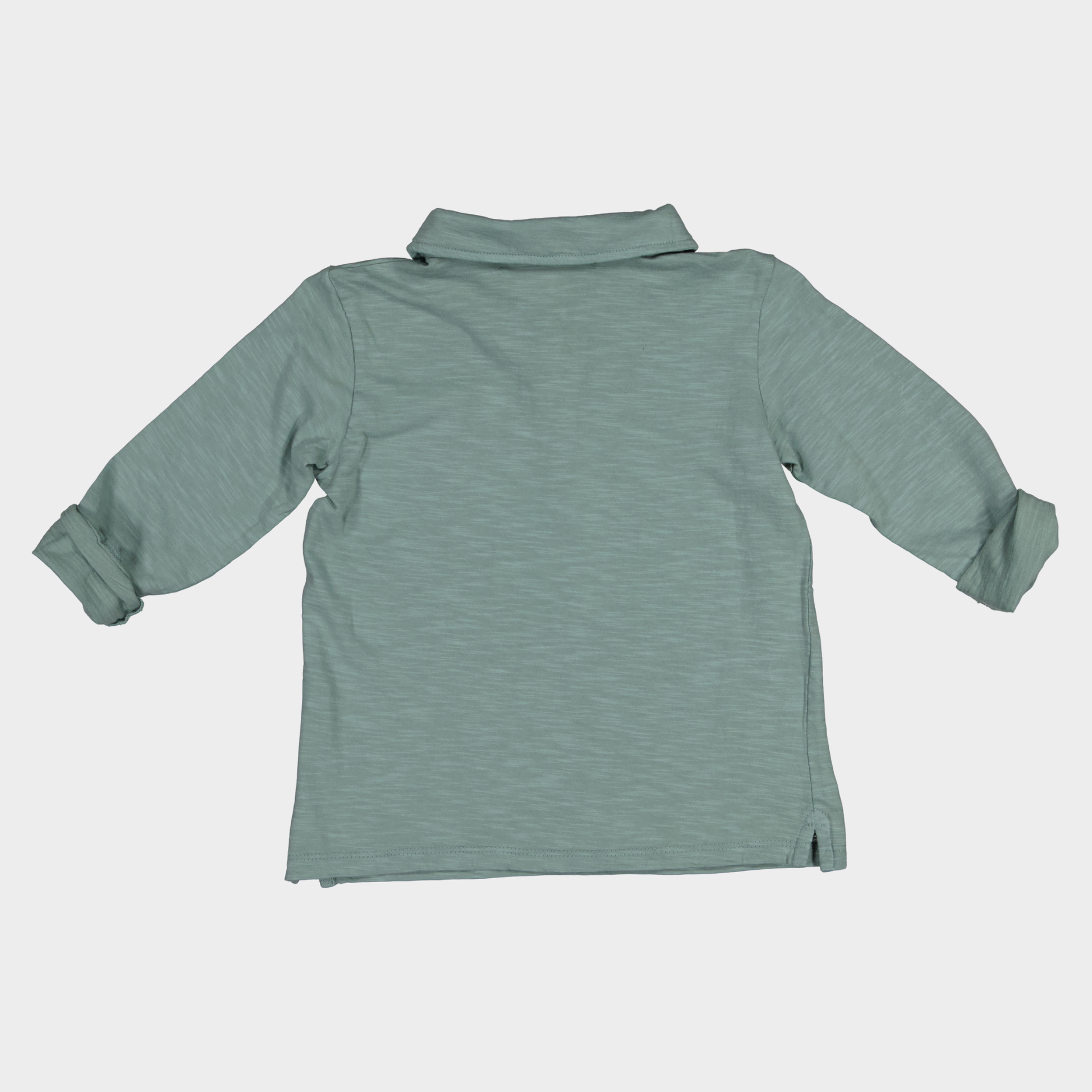 Polo de flamé en manga larga verdoso.Tres botones frontales.Bolsillo pequeño delantero.Cálido y confortable.Detalle de bordado 2468 a contraste en verde en frontal derecho.Bajos con aberturas laterales con interior de cinta espiga.