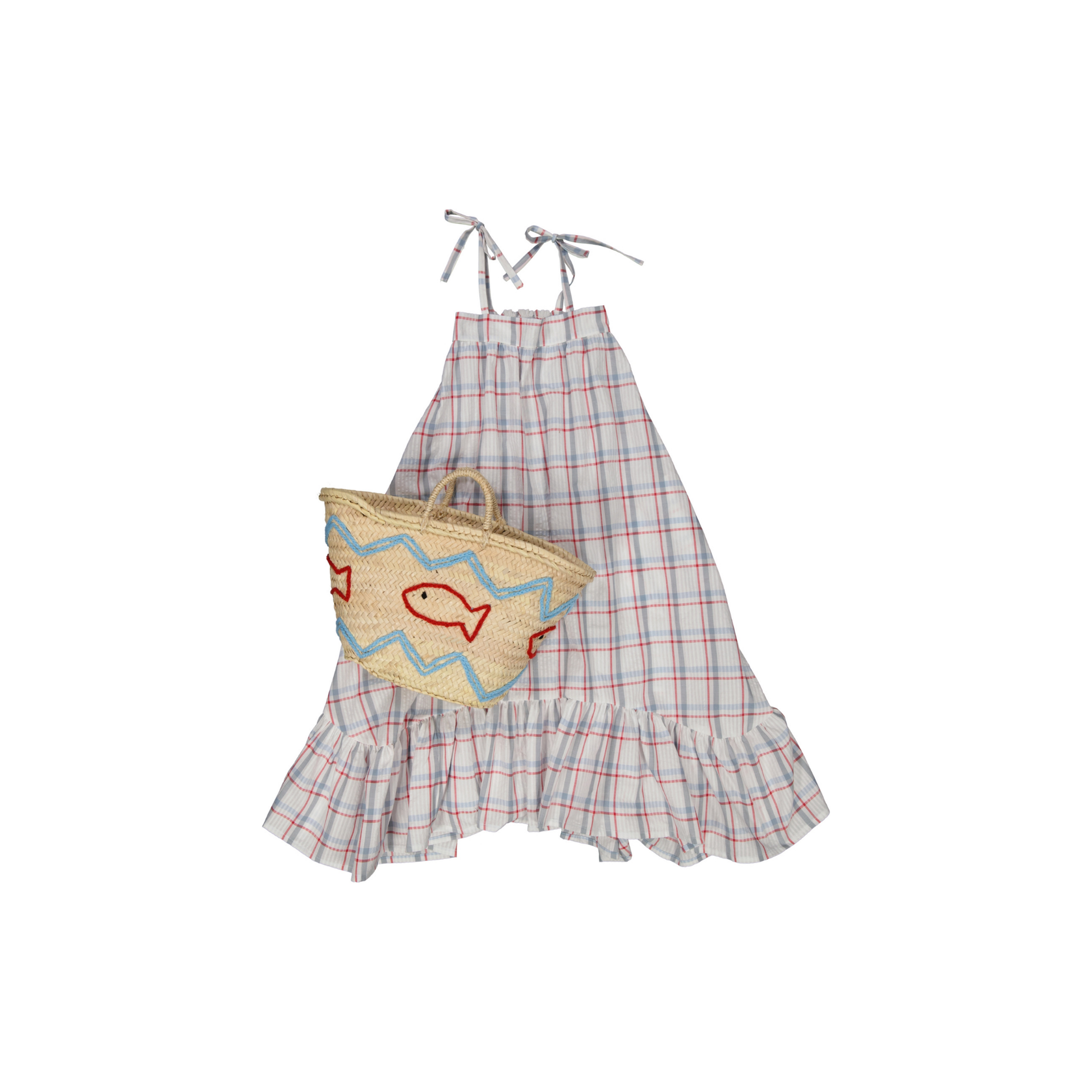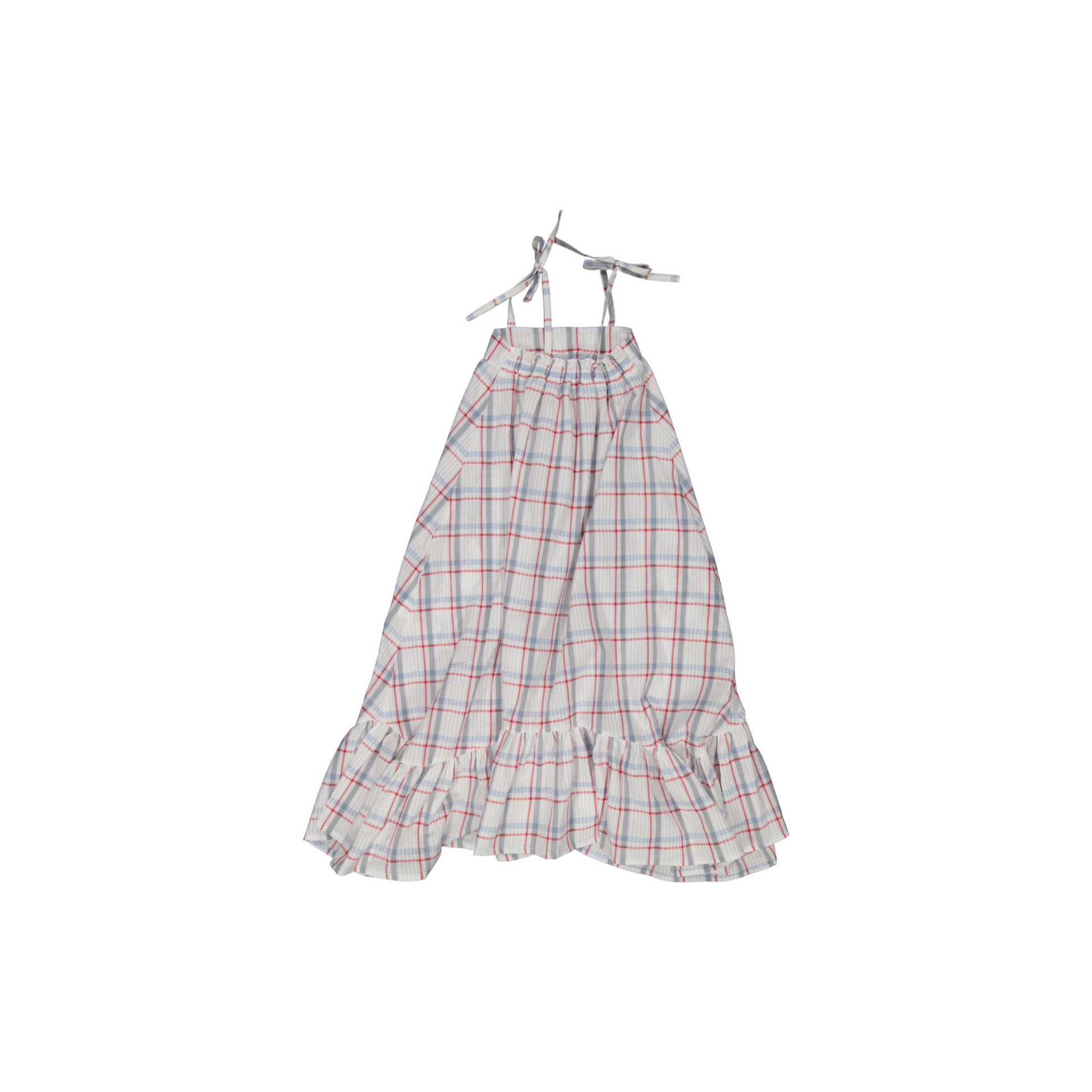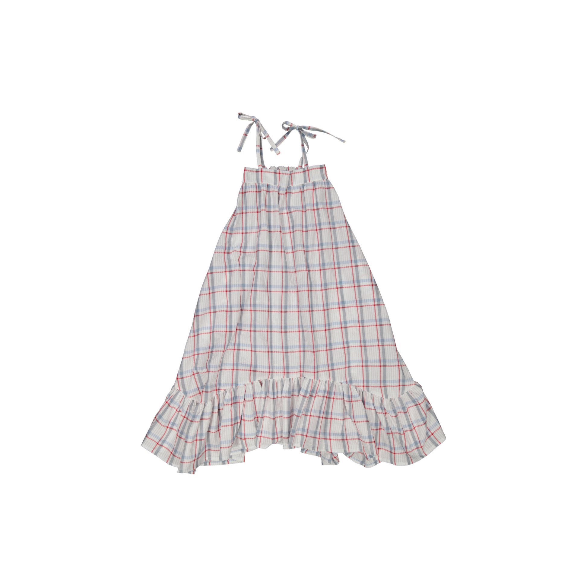 Vestido largo de algodón texturado de cuadros.Tirantes ajustables con lazada.Parte inferior con fruncido y volante asimétrico.Espalda con goma elástica.