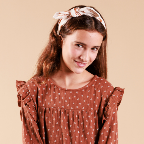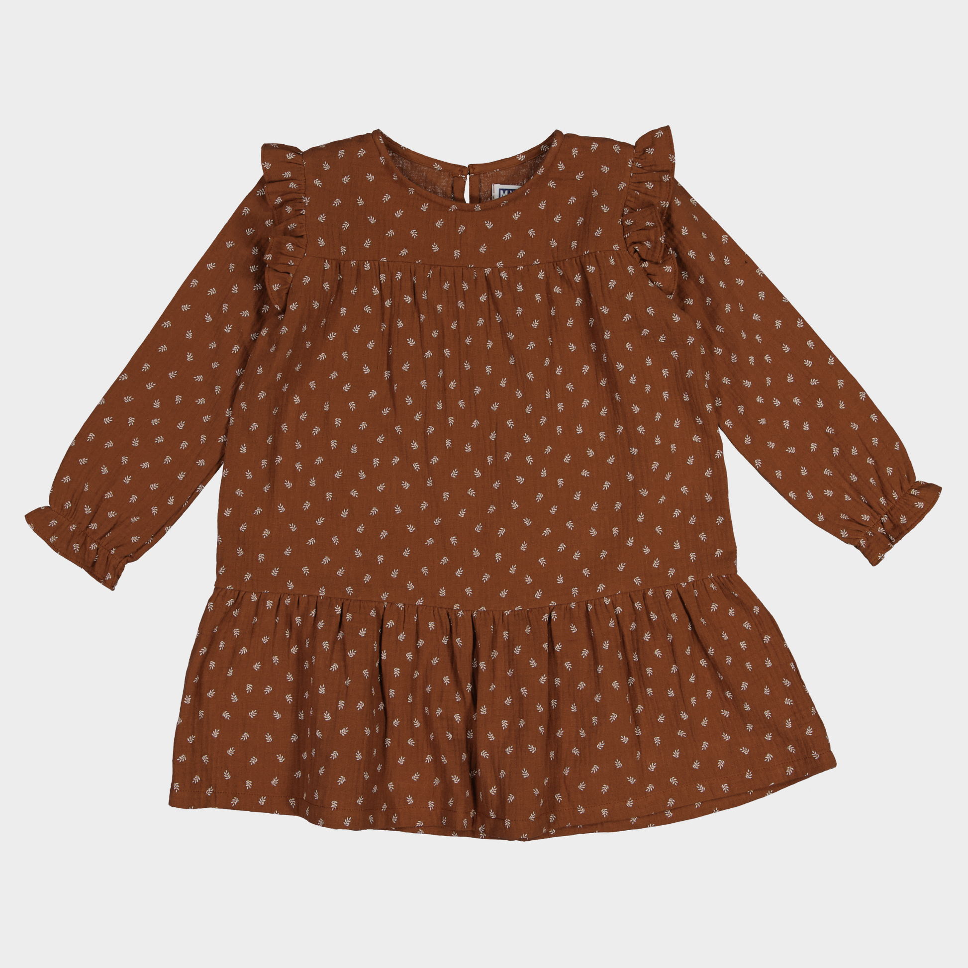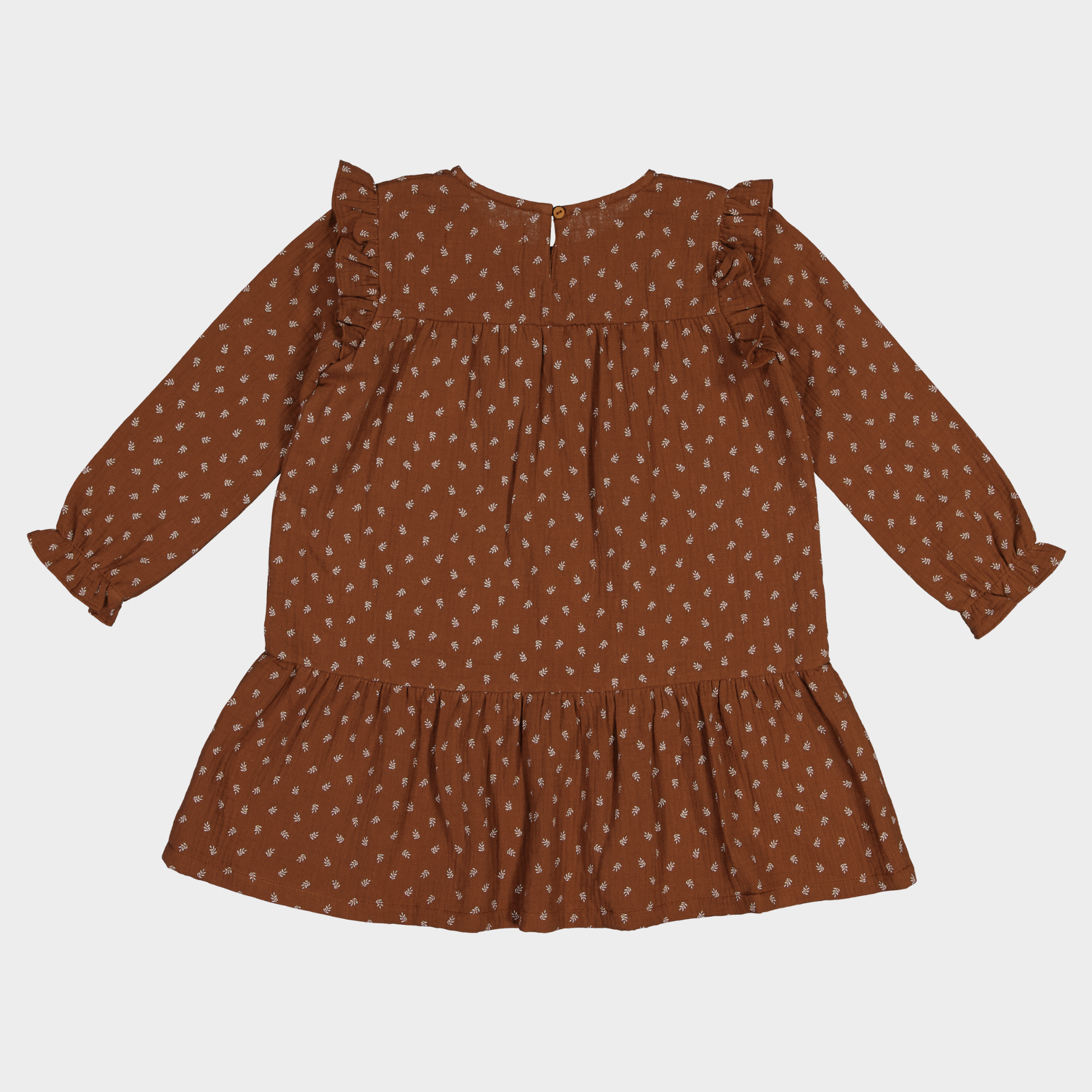 Vestido color caramelo con estampado de flores.Cuello redondo.Mangas largas con puños elásticos.Volantes en hombros.Abotonado en la espalda.Corte suelto ligeramente evasé.